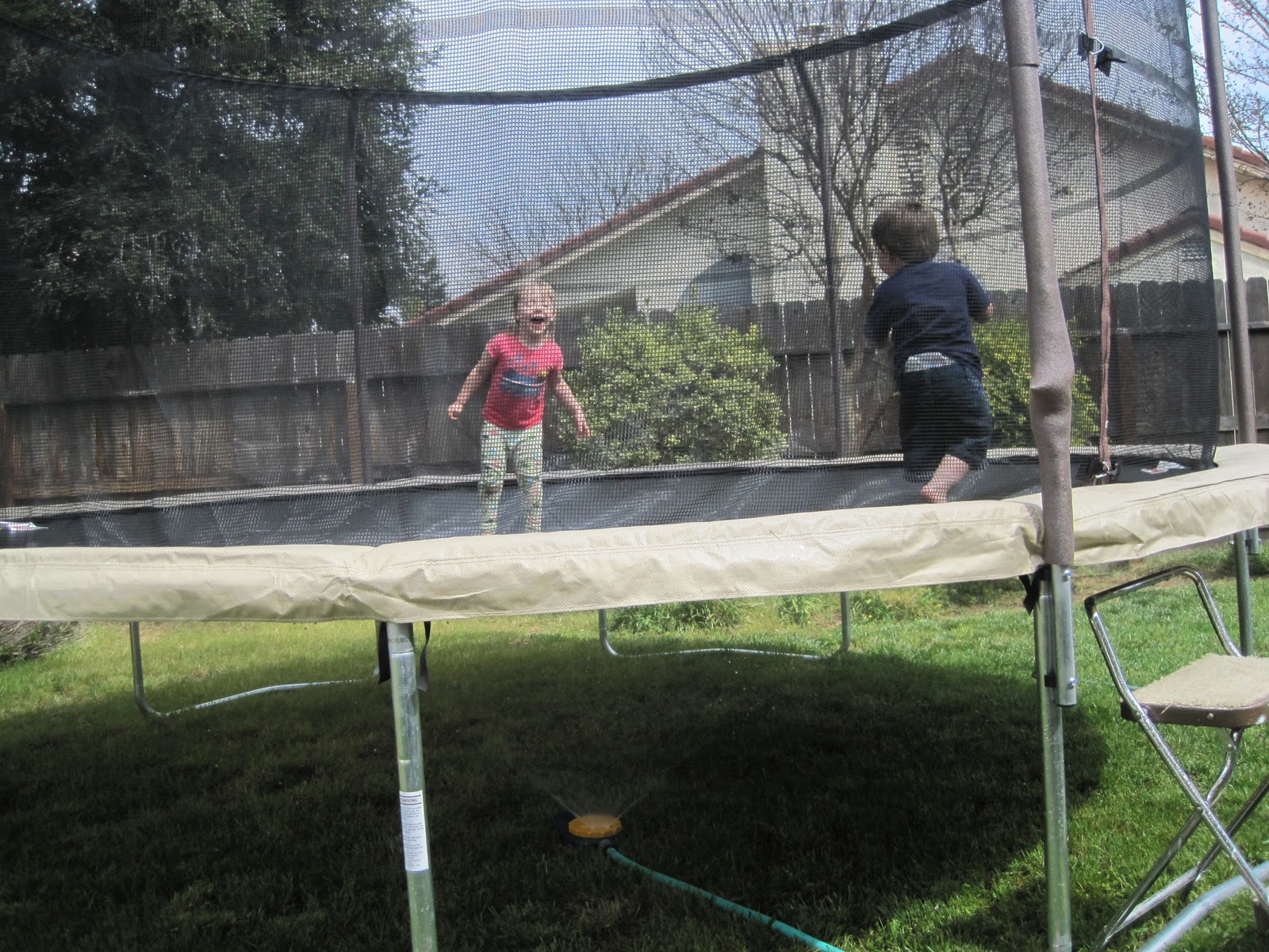 She is watching the kids jump on the trampoline in the backyard in this picture.
